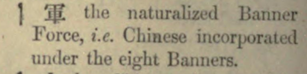 此后他对“汉军”翻译道“the naturalized Banner Force, i.e. Chinese incorporated under the eight Banners”,即“归化于八旗的势力,也就是被八旗兼并的Chinese”