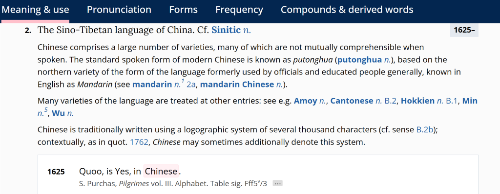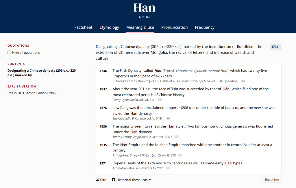 “Han”不仅没成为英语中开枝散叶,能自我延伸词义的自然的一部分,反而成为了“Chinese”词系身上的寄生虫,它试图从“Chinese”这样一个饱满自然立体,里面有国名,有族称,有语言名称的体系身上,抠去族称这样一个重要的基础功能。此举本身就够抽象了,同时还是单方面捣乱,没有民意基础,这种情况能被《牛津英语词典》收录才怪