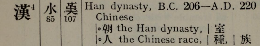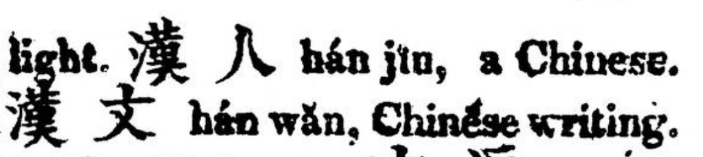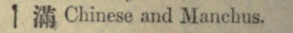 1900年,英国汉学家鲍康宁的《汉英分解字典》出版。这本词典对于“汉”的词义没有那么详细的列举,但是也明明白白地区分了“汉”作为汉王朝名称是“Han”,作为汉人族称则是“Chinese”,不同于满族族称“Manchus”