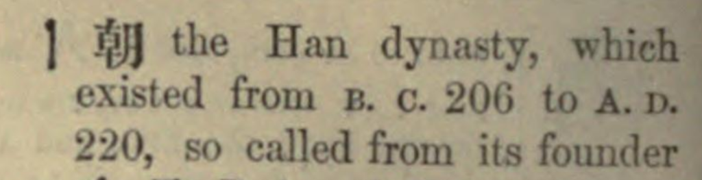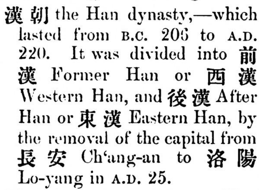 1892年,英国汉学家翟理斯的《华英字典》出版。这本词典对“汉”作为族称和朝代名称在英文中的翻译有了更详细的列举。对于“汉朝”,他翻译道“Han dynasty”,并详细区分了西汉和东汉,分别定都于长安和洛阳