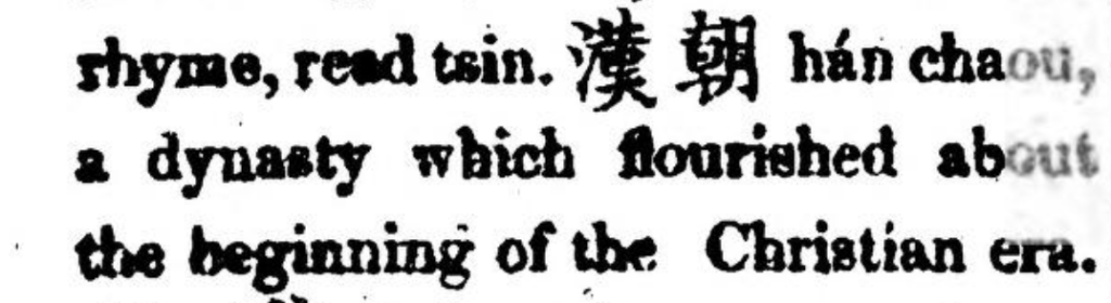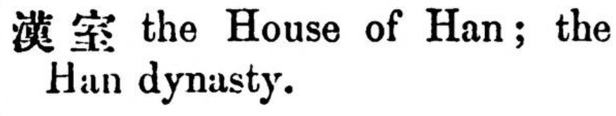 “汉室”一词也是第一次出现在汉英词典中,他翻译道“the House of Han; the Han dynasty”即“汉朝王室,或指汉王朝本身”