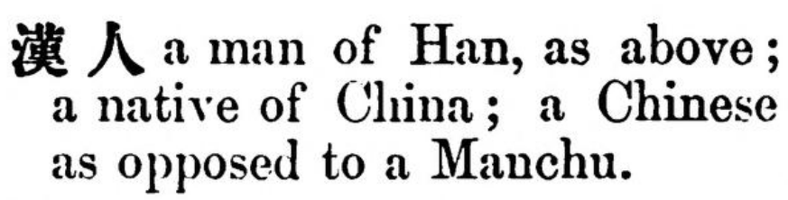 1874年,美国汉学家卫三畏的《汉英韵府》出版,对“汉”作为族称与朝代名称有了更详细的翻译。对“汉人”,他翻译道“a native of China; this use is most general north of Yangtz River, and indicates that the person is not a Banner-man”,即“China的土著,该用法在长江以北最为普遍,并特指此人没有旗籍”。虽然我不太明白他为什么觉得“汉人”这个词在长江以北更为普遍,但是汉人的确如他所说,即China的土著。