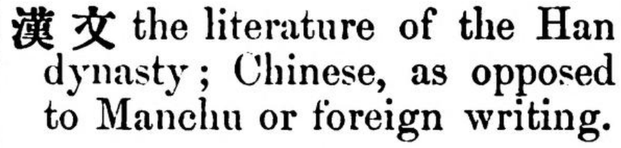之后的“汉文”再一次区分汉王朝名称与汉族族称,被细分为“the literature of the Han dynasty”,即“汉朝的文学”,和“Chinese, as opposed to Manchu or foreign writing”,即“汉文,不同于满文或外国文字”