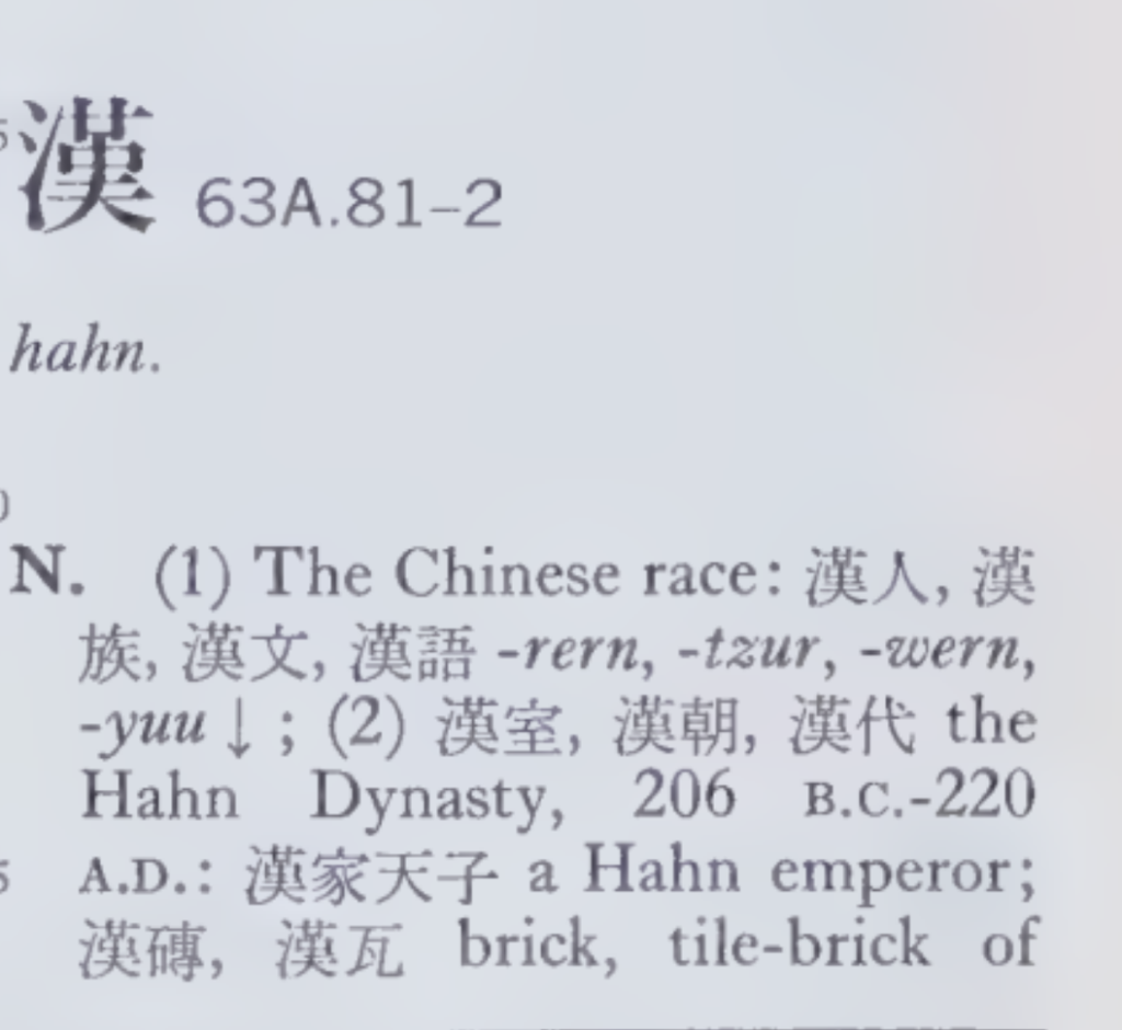 紧跟“汉室”着出现的“汉人”,明确区分汉王朝名称与汉族族称,被细分为“a man of Han, as above”,即“汉朝之人,如上”,和“a native of China; a Chinese as opposed to a Manchu”,即“China的土著;一个Chinese,而非一个满人“