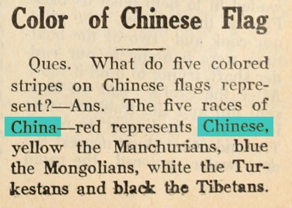 1912年《China (Scarboro Missions Magazine)》杂志有一个片段介绍北洋政府所主张的“中国国旗”五色旗,文中以“Chinese”称呼汉人,与中国的“China”国名一致,并与其它民族区别开