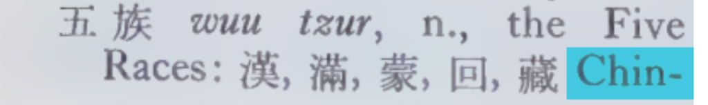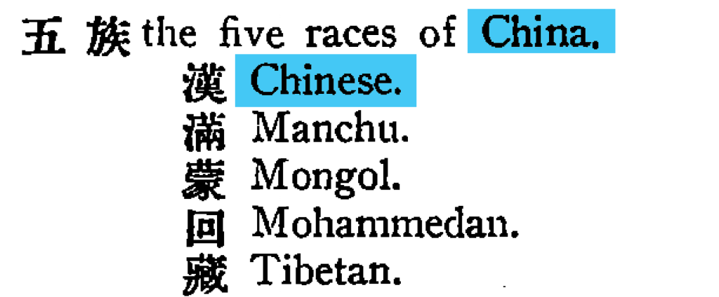 1931年,澳大利亚汉学家马守真的《汉英大辞典》出版。这是“五族”作为五个对立出现的族称第一次出现在汉英词典。虽然笔者认为与支共“56个民族”概念有异曲同工之妙的中华民国“五族”概念是中华民国是对满清势力范围的自我划分的“五大构成”即《五体清文鉴》中的“五体”的直接继承,是对满清政权看中国的殖民视角的延续,但是不论“五族”提出的动机如何,它的确在词典中提供了一个契机,让汉人的英文族称与中国境内的主要少数民族的英文族称对立出现在一起,因此可以一目了然“Chinese”就是汉人的专有英文族称,少数民族的存在并不是可以把“Chinese”矮化为“Han”的借口,少数民族各自有自己的族称,他们不是汉人,他们在民族属性上是non-Chinese,而不是Chinese。中国就是China,少数民族居于China领土的范围之内,并不妨碍他们他们继续保有自己与“Chinese”无关的英文族称,也不应该妨碍汉人作为China的主体民族(以族称冠名国名的民族 titular nation)保持自己的“Chinese”英文专有族称