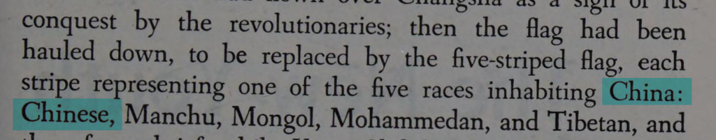 1950年出版的《毛泽东:红色中国的统治者(Mao Tse-tung: Ruler of Red China)》一书中有一段描写汉口地区“城头变换大王旗”情景的文字,其中也有对五色旗的描述,文中以“Chinese”称呼汉人,与中国的“China”国名一致,并与其它民族区别开