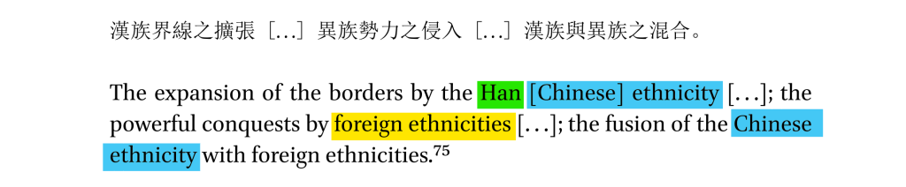 全书通篇自然使用“Chinese”的“汉人”的词义,与“non-Chinese”的“非汉人”含义,用以表达作者自己的观点。在间接转述他人观点时,作者也完全采用“Chinese”作为意译,而非音译