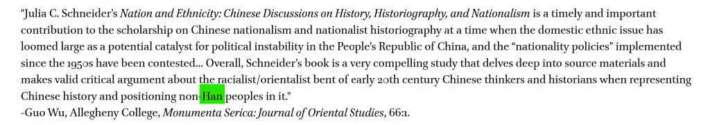 搞笑的是,在这本书的书籍序言网站主页下方的“About”的“Review Quotes”里,一个出身于支共北京语言大学现任职于美国阿勒格尼文理学院的人在其对这本书的点评里使用了“non-Han”这个词用以表达“non-Chinese”的含义。作者通篇写“non-Chinese”,它一个爱喝支共墨水的人还“纠正”起作者了?真的是洋人不害你,支那畜害自己