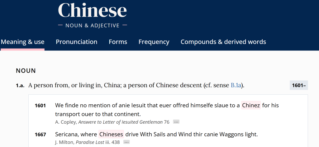 之后的1601年,与现在拼写标准较为一致的“Chinese”拼写出现,A. Copley在《对耶稣会士来信的答复(Answere to Letter of Iesuited Gentleman)》中写道:“我们未发现任何耶稣会士曾自愿为汉人提供前往该大陆的船票。(We finde no mention of anie Iesuit that euer offred himselfe slaue to a Chinez for his transport ouer to that continent.)”